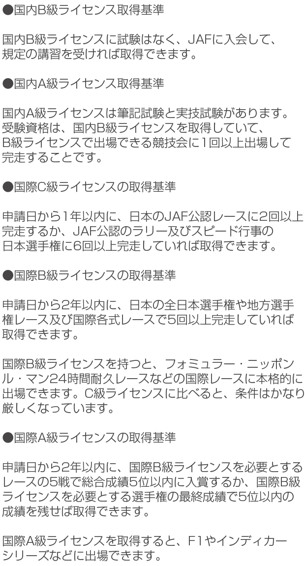 ここでレースをするために必要なライセンスについて、下記に分かりやすく説明していますので、各ライセンスごとにどのような基準があるのかご覧になってみてください。